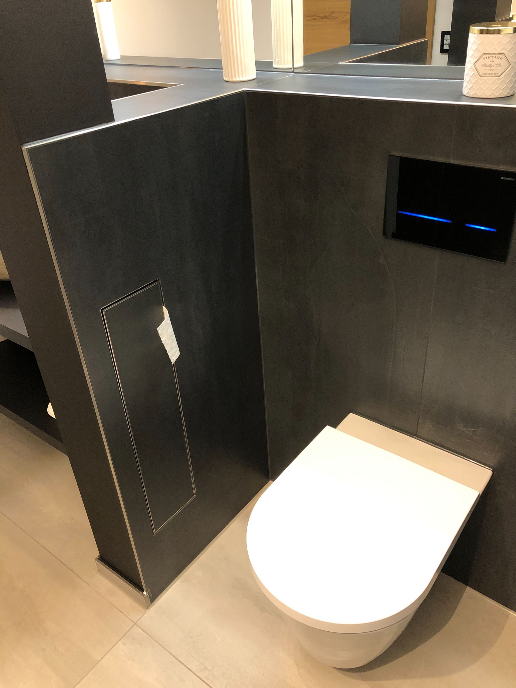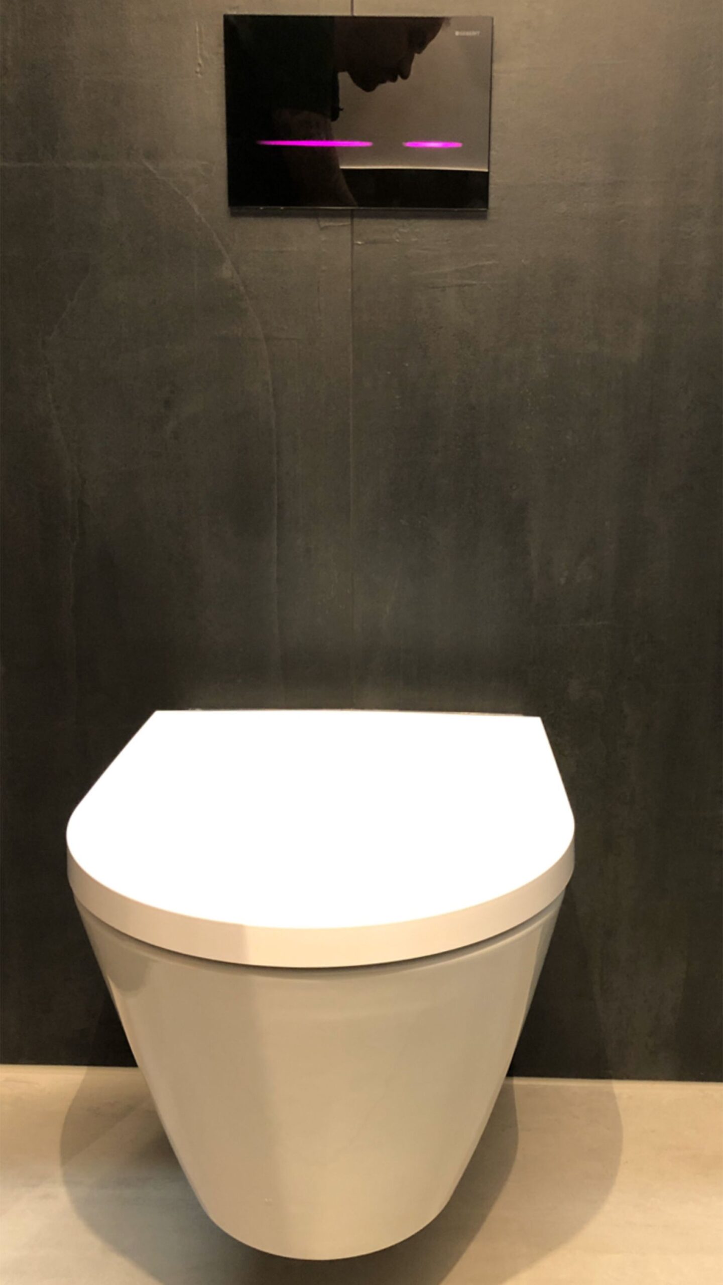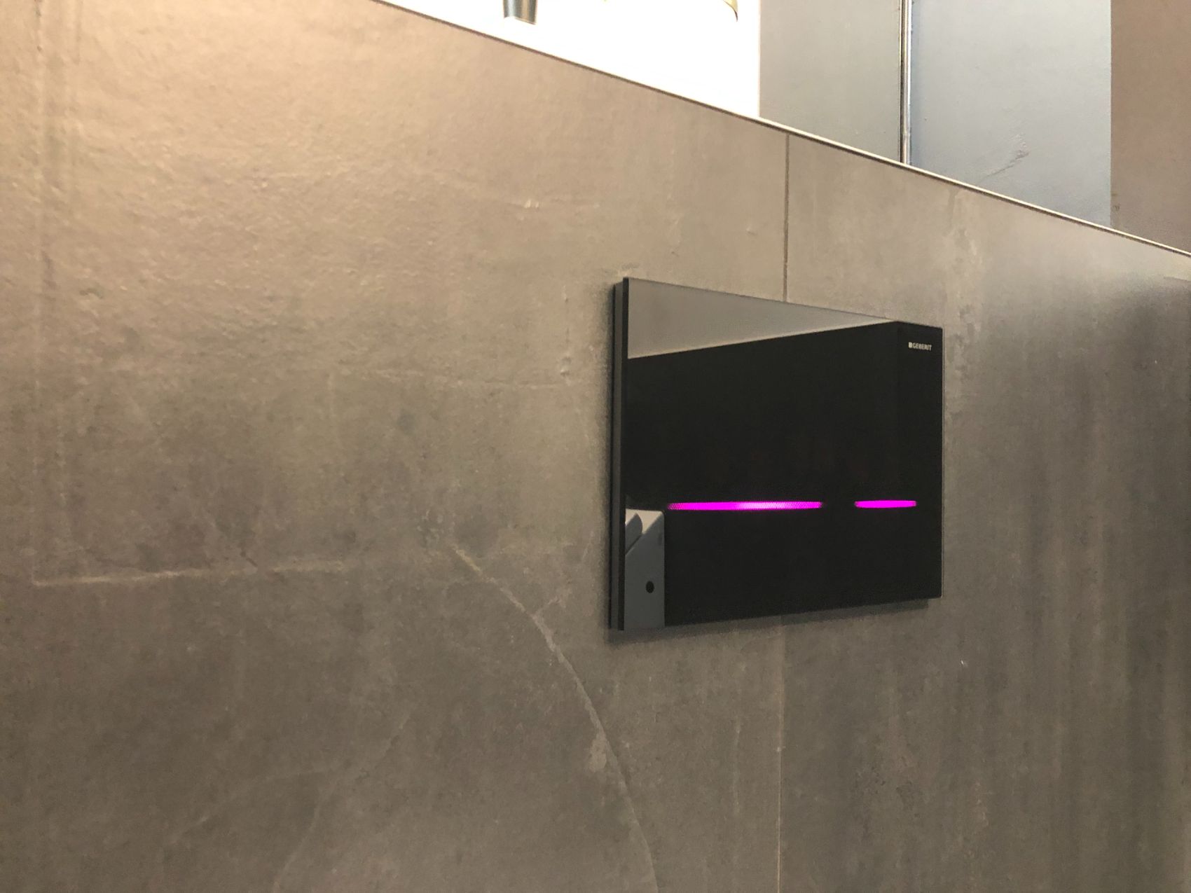Technisch setzt das Gäste-WC ebenfalls Maßstäbe: Verbaut wurde die Geberit HyTronic Sigma80 – eine berührungslose Drückerplatte mit LED-Lichtbalken für die 2-Mengen-Spülung. Die Spülauslösung erfolgt komplett kontaktlos, die beleuchteten Zonen leuchten beim Herantreten auf – modern, hygienisch und ein echter Blickfang.