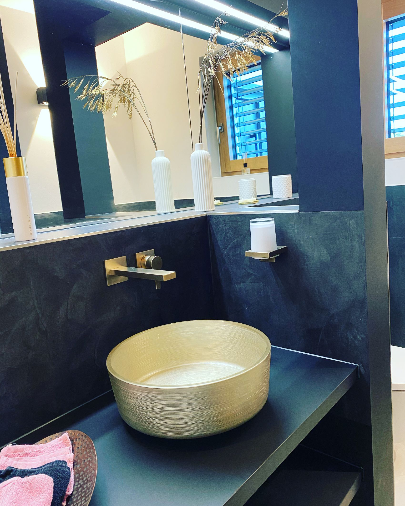 Ein besonderes Highlight ist der Spiegel über die gesamte Wandbreite, der durch einen eleganten Vorsprung geführt wird. In Kombination mit dem fein abgestimmten Beleuchtungskonzept entsteht eine außergewöhnliche Tiefenwirkung und ein stimmungsvolles Ambiente. Ergänzt wird das Ganze durch einen integrierten Lautsprecher, der Musik direkt ins Gäste-WC bringt – ein Detail, das überrascht und begeistert.