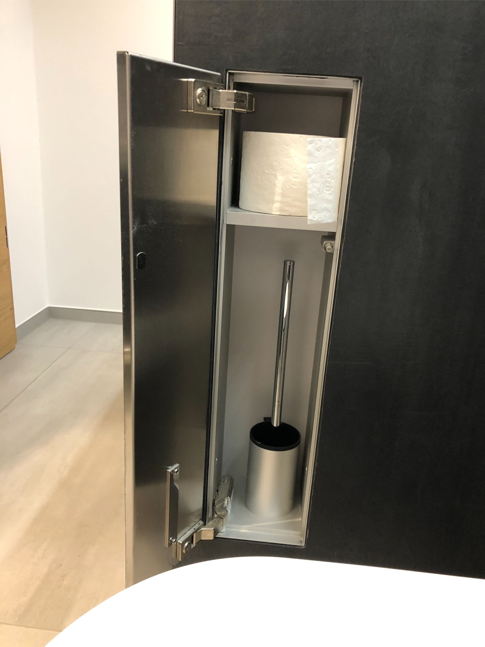 Auch funktional überzeugt dieser Raum mit cleveren Lösungen: Eine echte Besonderheit ist der versteckte WC-Papierrollenhalter inklusive integrierter Klobürste, dezent hinter einer Tür verborgen (siehe Foto). Nichts stört die Optik – alles ist da, wo man es braucht.