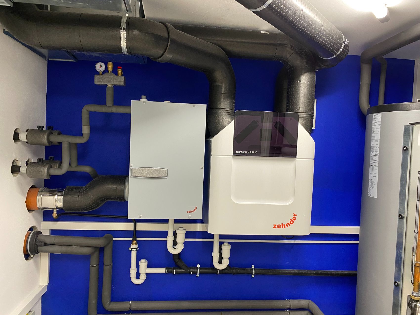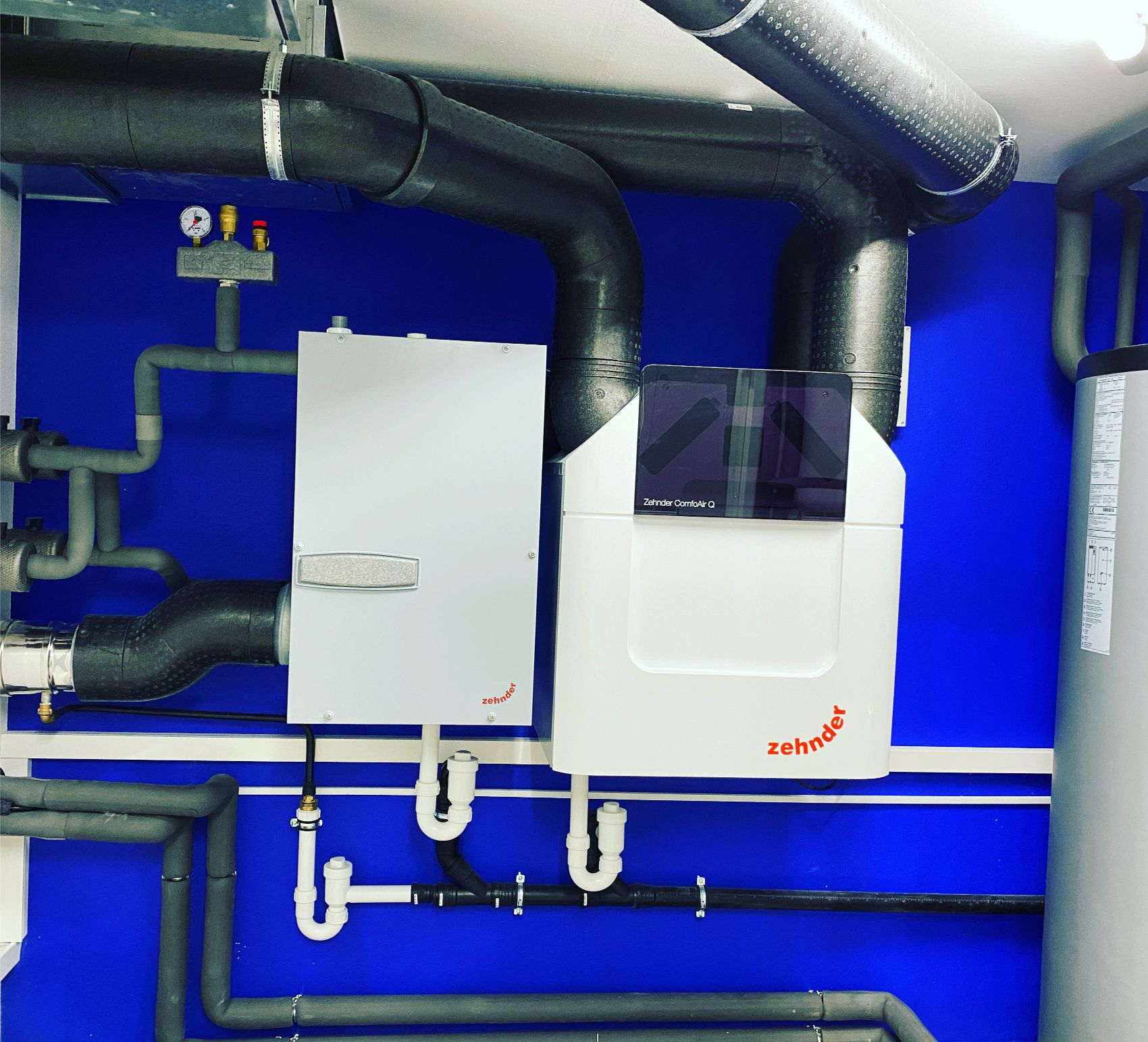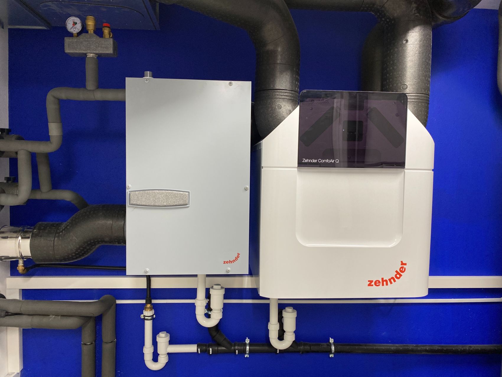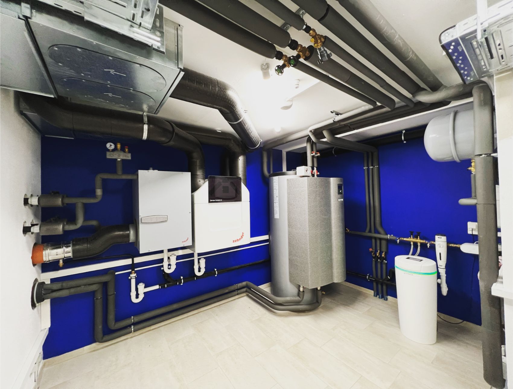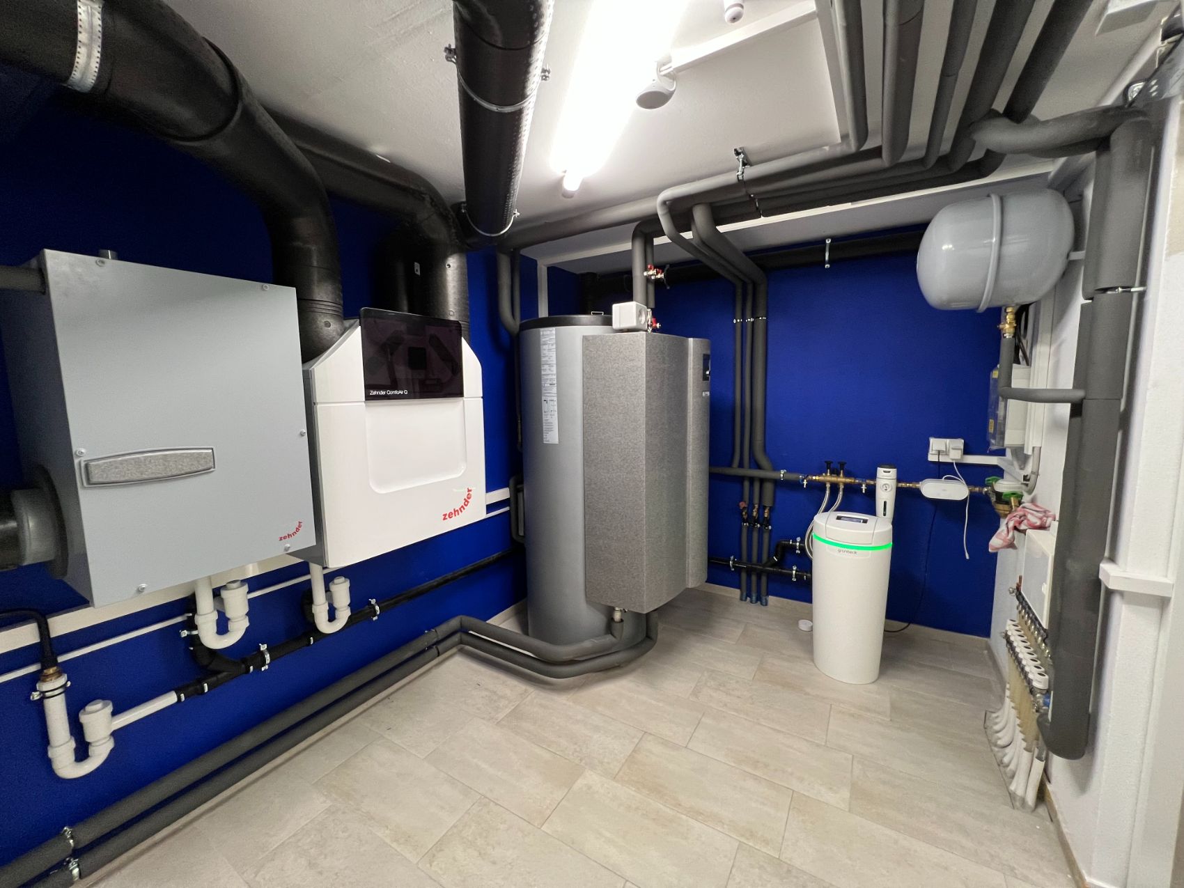 Ergänzt wird das System durch eine zentrale Lüftungsanlage mit Wärmerückgewinnung. Diese sorgt nicht nur für einen kontinuierlichen Luftaustausch, sondern auch für ein angenehmes Raumklima – ganz ohne manuelles Lüften. Gleichzeitig werden Wärmeverluste minimiert und die Energieeffizienz des gesamten Gebäudes weiter gesteigert.